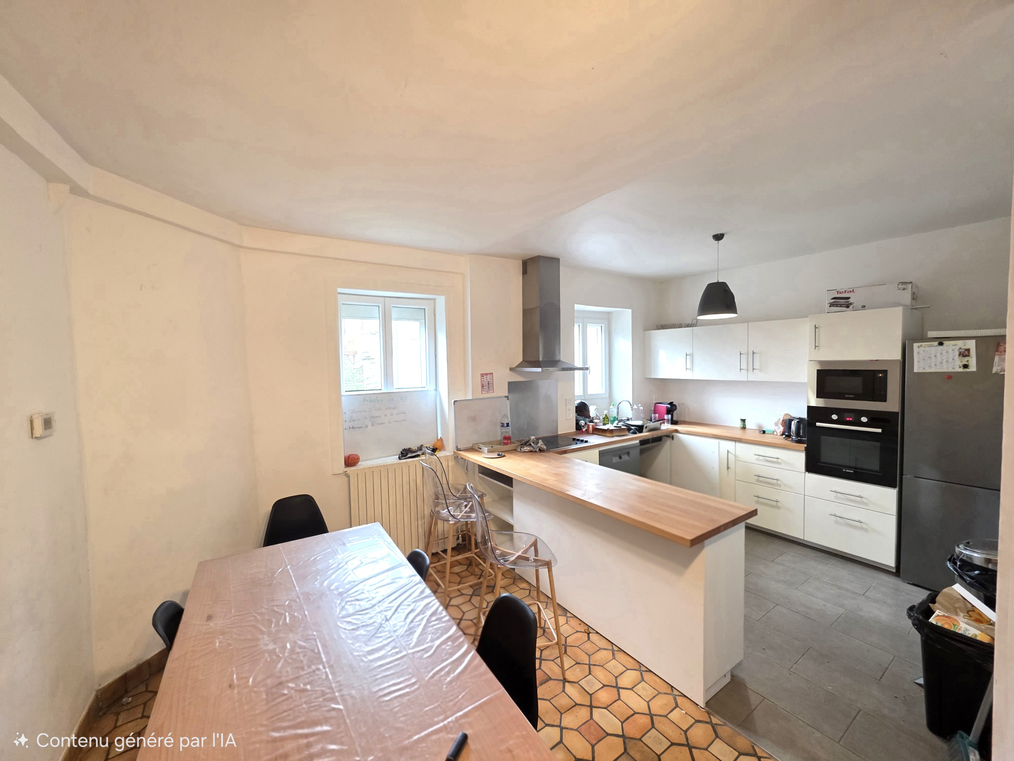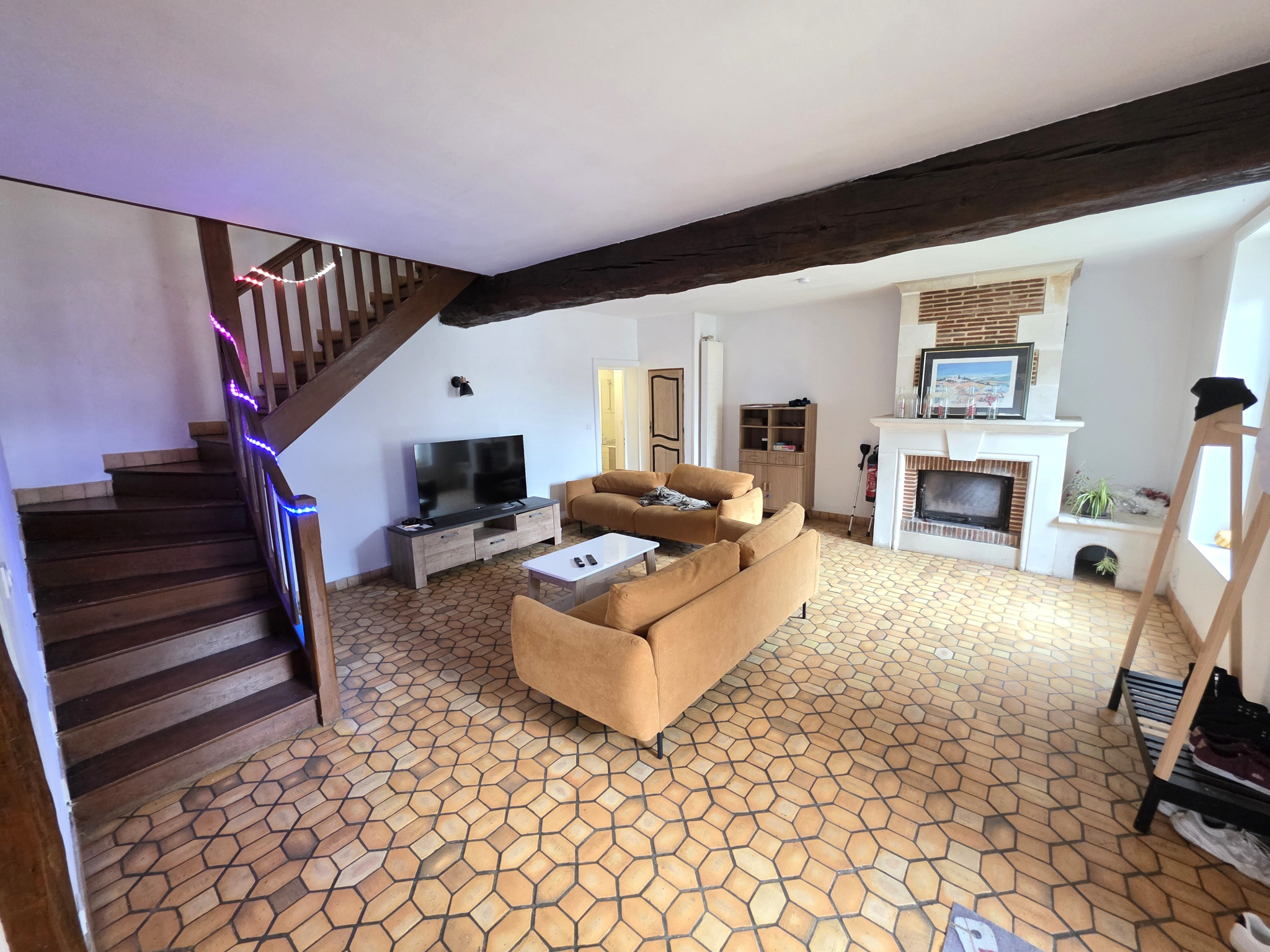 Au rdc : cuisine, salle à manger, grand séjour, dégagement, salle d'eau avec wc et deux chambres.