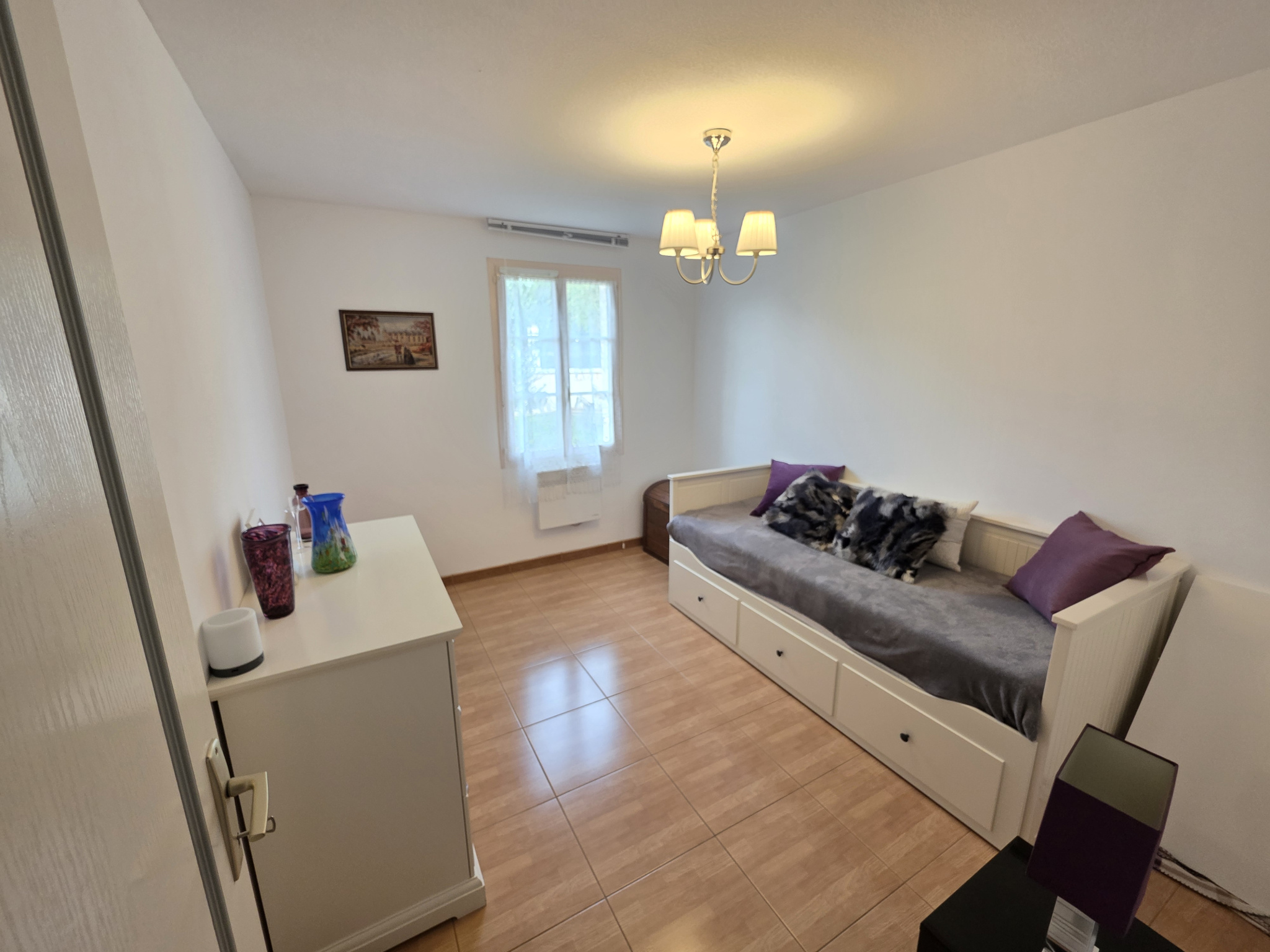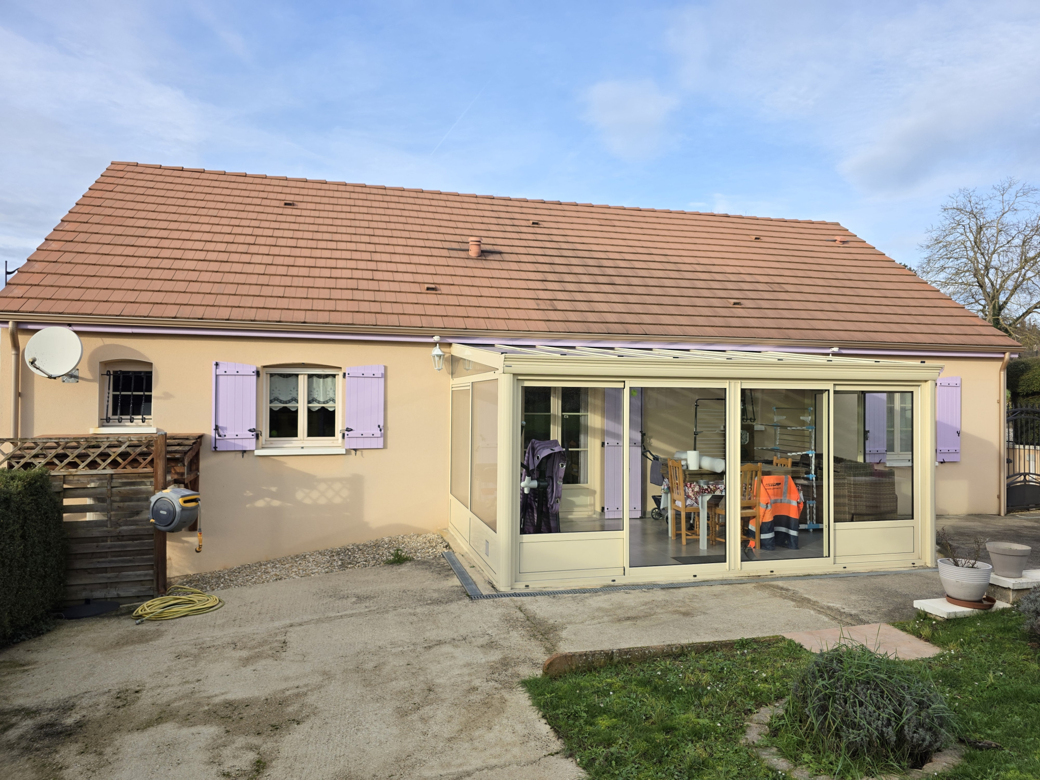 Dans le prolongement du séjour se trouve une véranda avec store, qui est une vraie pièce additionnelle.