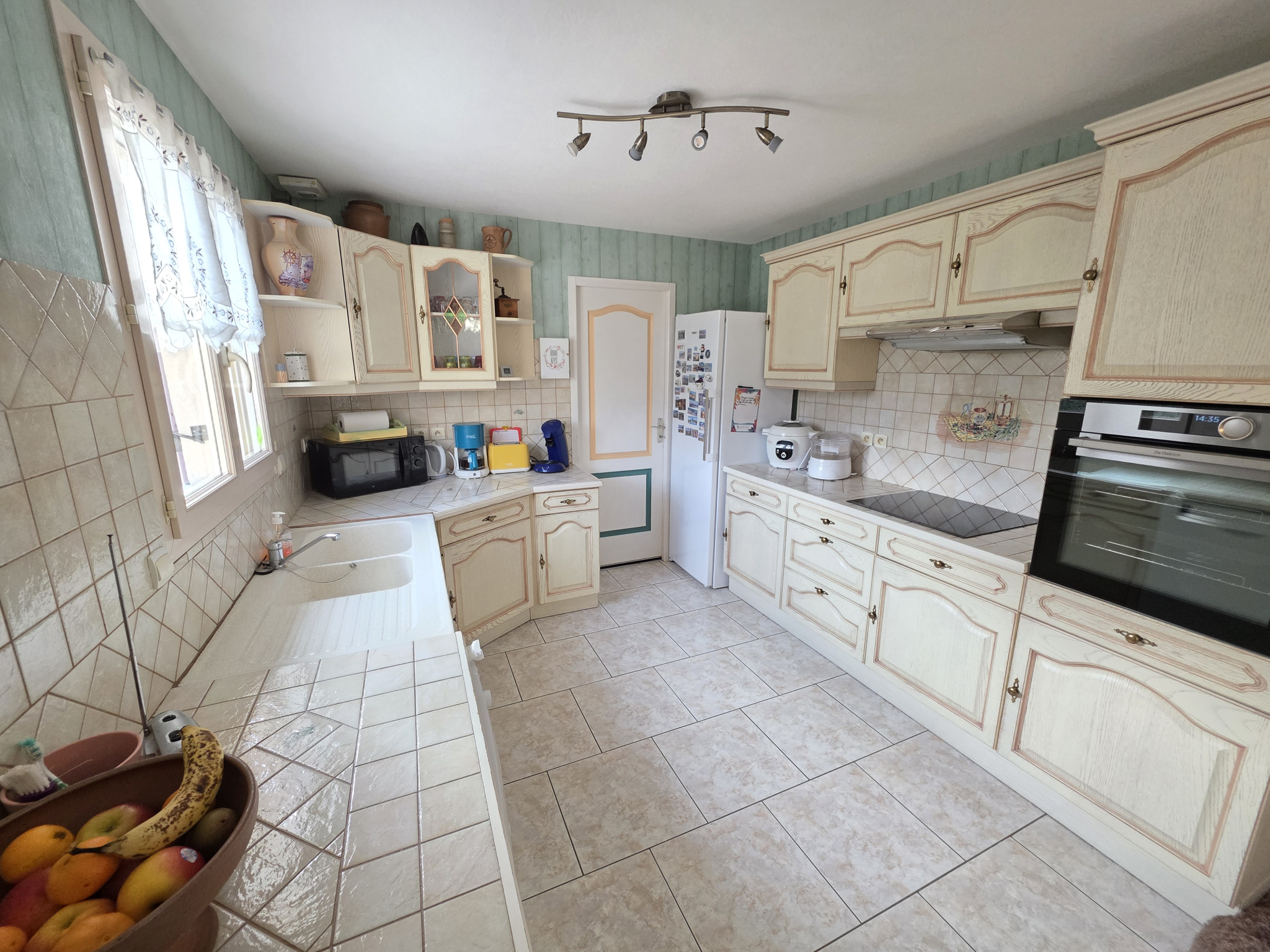 Un large séjour traverssant, une cuisine équipée et son cellier, dégagement, 3 chambres, wc, salle de bains avec douche.