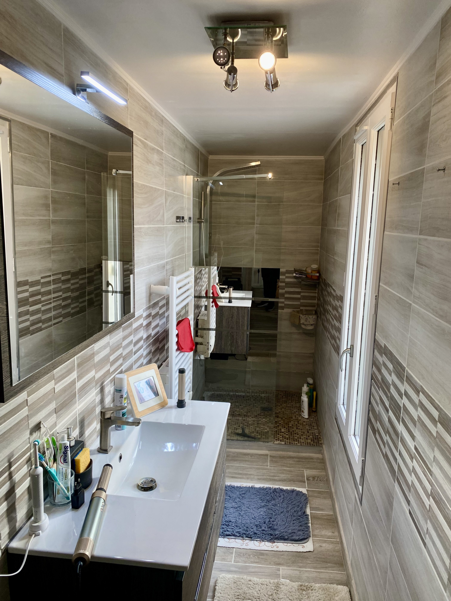 La maison entièrement rénovée comprend au rez de chaussée : une cuisine aménagée et equipée avec coin repas ouverte sur un salon/séjour, à l'étage : 2 chambres, salle d'eau, wc et un grand palier avec la possibilité de créer une 3 ème chambre.